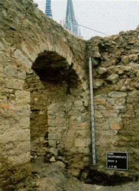 Die SynagogenHöhepunkt der Ausgrabungen, die zwischen 1995 bis 1998 das Bild des Neupfarrplatzes prägten, war sicherlich die Entdeckung der frühgotischen Synagoge. Bis zu diesem November 1995 hatte man das Gotteshaus unter der Neupfarrkirche vermutet. Albrecht Altdorfer, der berühmte Regensburger Maler und spätere Stadtbaumeister hatte die Synagoge kurz vor ihrer Zerstörung detailgenau gezeichnet, so dass die Archäologen und Bauforscher die ergrabenen Mauern im Westen der Kirche, den trapezförmigen Grundriss mit den drei großen Säulenfundamenten in der Mittelachse, als das jüdische Gotteshaus identifizieren konnten. Eine wissenschaftliche Sensation war dann aber die Erkenntnis, dass die "Altdorfer-Synagoge" auf einem wesentlich älteren Vorgängerbau stand. In ganz Deutschland sind mit Köln und Speyer nur drei Synagogen dieses Alters, vom Anfang des