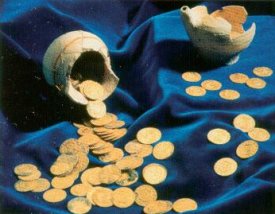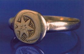 Gold aus dem jüdischen ViertelIn diesem gesellschaftlichen Zusammenhang sind auch die Schatzfunde im ehemaligen Judenviertel zu sehen. Im Sommer 1996 wurden bei den archäologischen Untersuchungen eines jüdischen Kellers 624 Goldmünzen gefunden. Sie waren, dicht gepackt in drei kleine Keramikgefäße aus einer Regensburg - Prebrunner Hafnerwerkstatt, unter dem Lehmfußboden vergraben. Dieser Münzfund wird dem Krisenjahr 1388 als Vergrabungszeit zugeordnet. Es war jenes Jahr, in dem der Städtekrieg für Regensburg in eine entscheidende Phase trat. Ganz gleich welchen Vergrabungsgrund man annimmt, Heimlichkeit war allemal geboten. Neben diesem "Schatzkeller" wurde in einem ehemals kreuzgratgewölbten Halbkeller ein sehr fein gearbeiteter goldener Fingerring mit dem Siegel der jüdischen Gemeinde gefunden. Hier konnten auf knapp