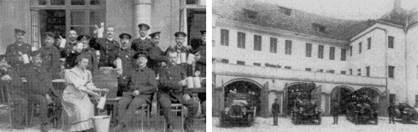 Platzmangel war das große Stichwort im Gebäude. Nicht nur die Gerätschaften waren teilweise woanders untergebracht, auch der tägliche Dienstbetrieb brachte so seine Schwierigkeiten. Wurde die Wehr zum Einsatz gerufen, mussten gleich einige Straßenzüge für den Allgemeinverkehr gesperrt werden. Am 01.06.1927 wurde die Berufsfeuerwehr der Stadt Regensburg gegründet, übernahm die Feuerwache am Haidpiatz und auch teilweise die Gerätschaften der Freiwilligen Feuerwehr. Die Kriegsjahre von 1939-1945 waren für Freiwillige- und Berufsfeuerwehr die größte Belastung in ihrer Geschichte. Jeder Fliegeralarm hatte ein Ausrücken zur Folge - wenn auch teilweise vorsorglich. Die Hauptfeuerwache im Thon-Dittmer-Palais mitten in der Altstadt hätte leicht zur tödlichen Falle für Feuerwehr und Stadt werden können. Man munkelte sogar: "Wenn's im Thon-Dittmer-Haus mal richtig brennt, verbrennt die Feuerwehr mit!" Die Feuerwehr verteilte ihre Fahrzeuge auf die äußeren Stadtteile und rückte bei Alarm sternförmig auf die Brandobjekte zu. (*12) Am 13. April 1965 hatte die Platznot für die Feuerwehr endlich ein Ende. Sie konnte das neu errichtete Gebäude in der Greflingerstraße beziehen.
