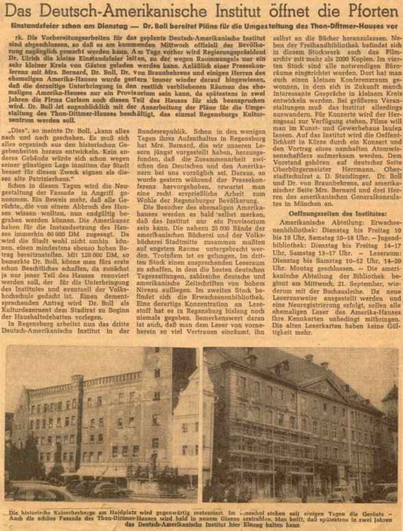 Vierter Teil: Deutsch-Amerikanisches InstitutAmerika: (Nach Amerigo -> Vespucci), die beiden Erdteile Nordamerika und Südamerika, die als "Neue Welt" der Alten Welt gegenübergestellt werden und durch die Land- und Inselbrücke Mittelamerika miteinander verbunden werden. (*13)Nach dem Zweiten Weltkrieg erfuhr unser Palais eine grundlegende Veränderung. Schritt für Schritt wurde es zu einem Kulturhaus umgebaut. Einen wichtigen Anteil daran hatte 1955 die Gründung des Deutsch-Amerikanischen-Instituts, das bis zum Jahre 1999 als Verein existierte. Unzählige Veranstaltungen im Hause, eine umfassende englischsprachige Bibliothek und eine kompetente Beratung zeugen von der bedeutungsvollen deutsch-amerikanischen Partnerschaft, die in Regensburg demonstriert wurde und wird.